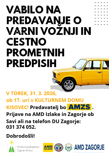 V torek, 31. 3. 2026, ob 17. uri bo v Kulturnem domu Kisovec potekalo predavanje o varni vožnji in cestno prometnih predpisih. Predaval bo predstavnike AMZS.